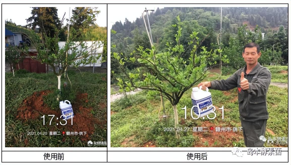 效果:冲施岛本酵素菌根菌7天后,树势恢复,新叶新芽明显增多,效果显著。