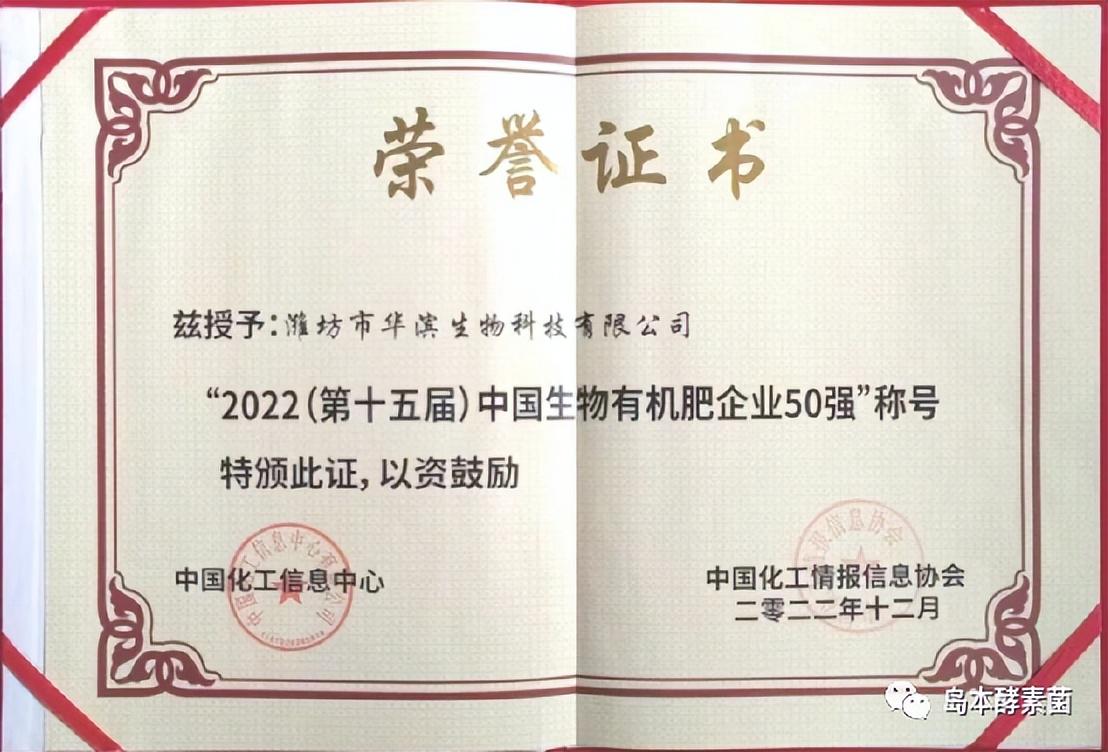 2022年12月19日,“2022(第十五届)中国化肥百强评选发布暨中国化肥产业高质量发展高峰论坛”在海南省海口市举行。会上发布了“2022中国生物有机肥企业50强”榜单,岛本酵素生产企业——潍坊市华滨生物科技有限公司凭借其突出的创新研发能力、品牌贡献能力、绿色发展能力及优质的经营管理能力连续多年上榜,且名列前茅!