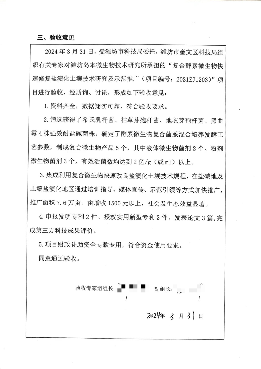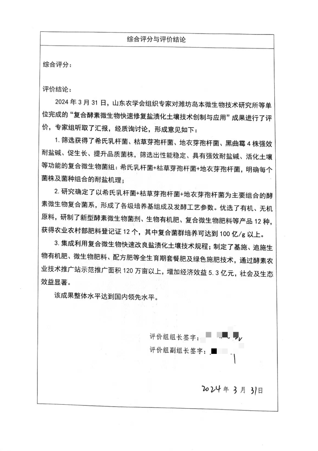 本项目研发的复合酵素微生物改良盐碱地技术具有安全、高效、易操作等特点,经第三方评价机构鉴定,科技成果达“国内领先水平”,并以其先进的技术成果和突出的应用效果完成了潍坊市科技局成果验收。